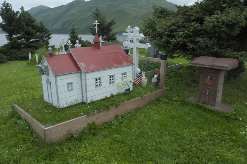 Grab mit Kirchenmodell